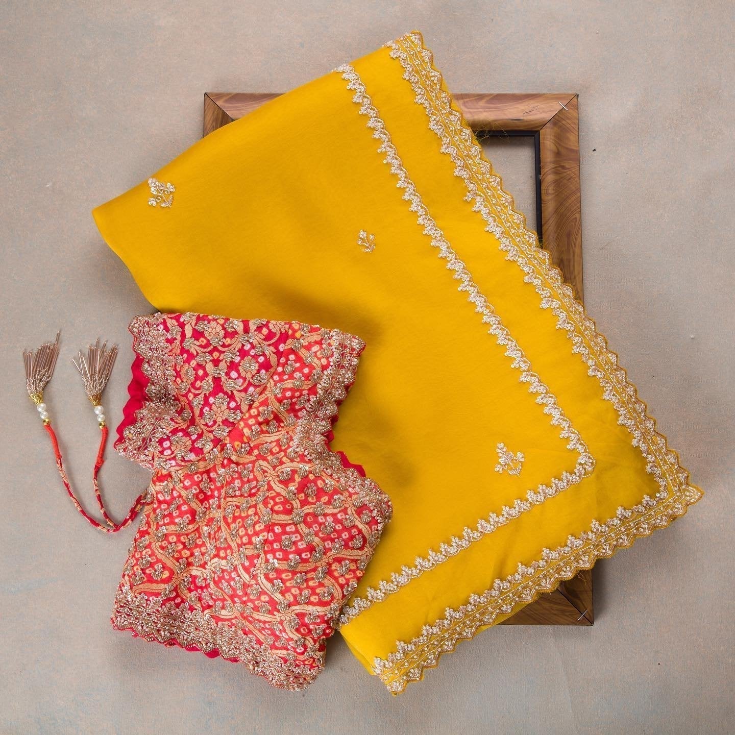 Composition: Sari and blouse length- 6.5 metres. Includes coordinated unstitched blouse piece
