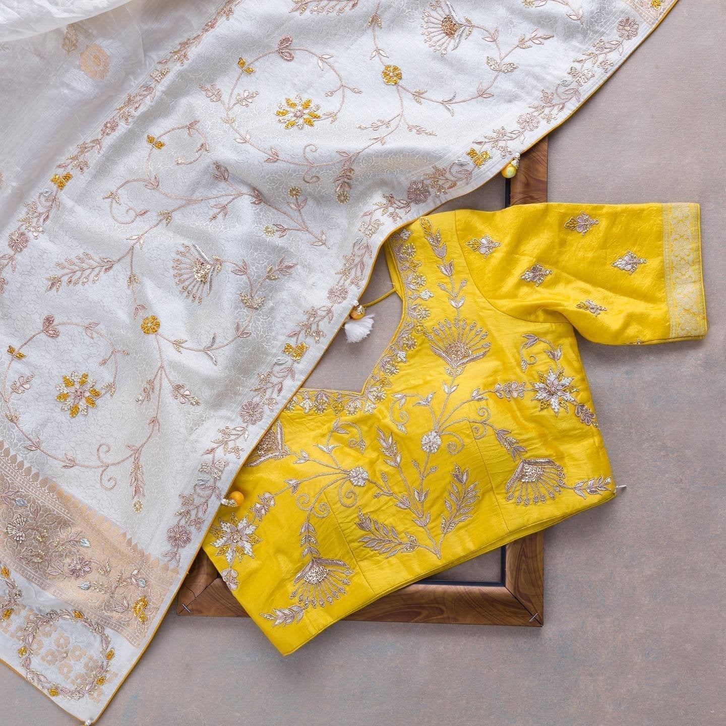 Composition: Sari and blouse length- 6.5 metres. Includes coordinated unstitched blouse piece