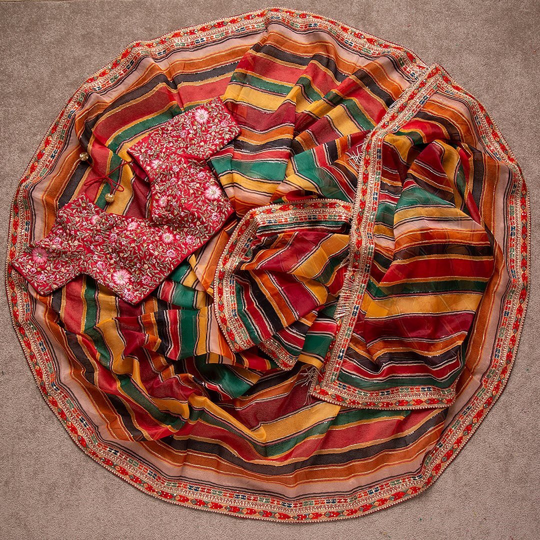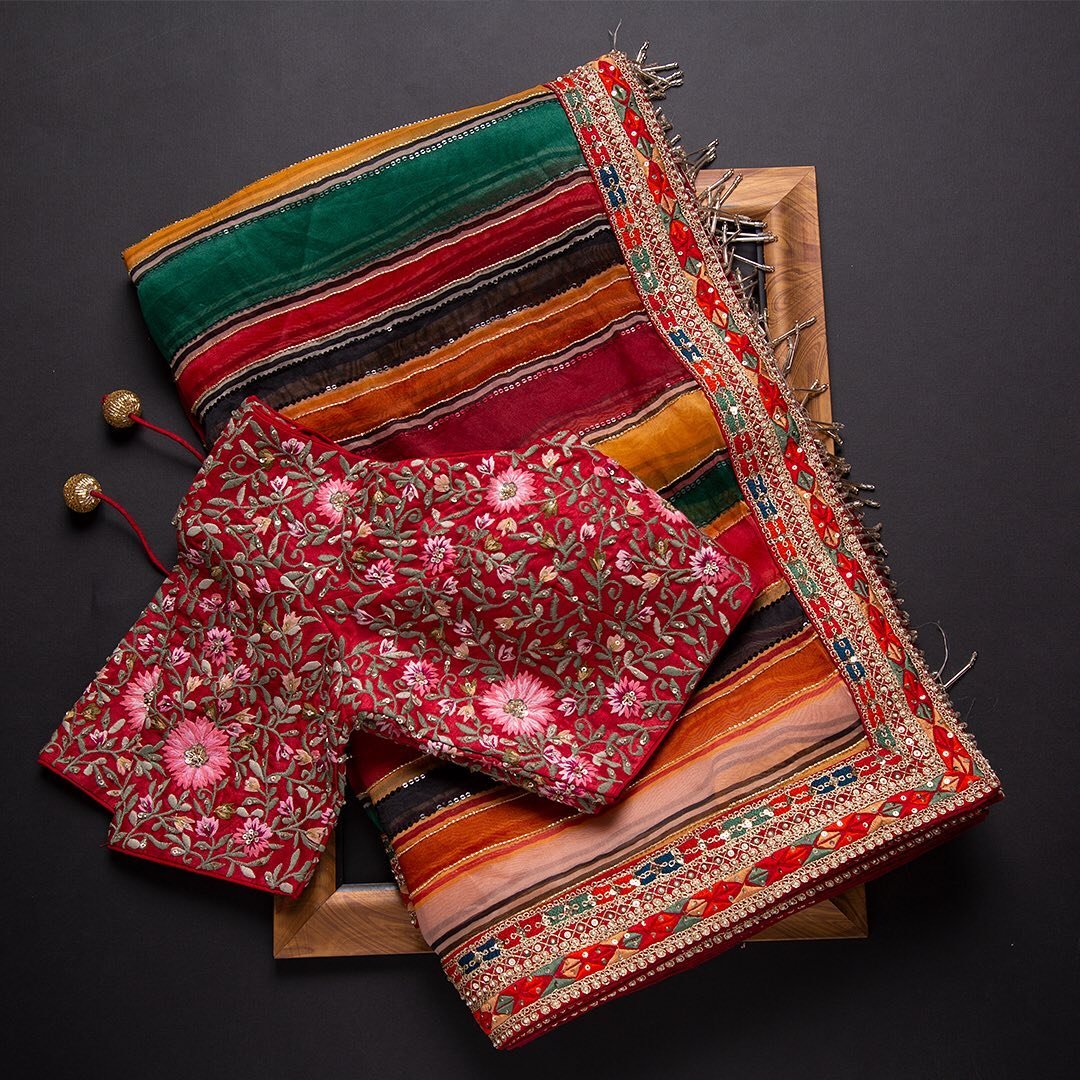 Composition: Sari and blouse length- 6.5 metres. Includes coordinated unstitched blouse piece