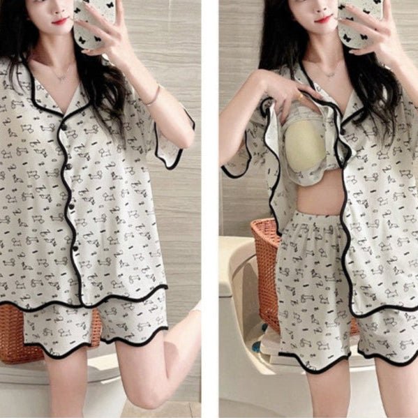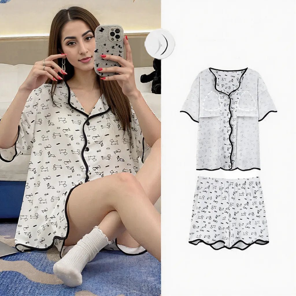 Lounge in full cuteness with this cream and black ruffle-trim pajama set featuring playful puppy prints 🐶 It’s not just adorable—it has a built-in bra for that comfy, no-bra-needed freedom you’ll love 💤