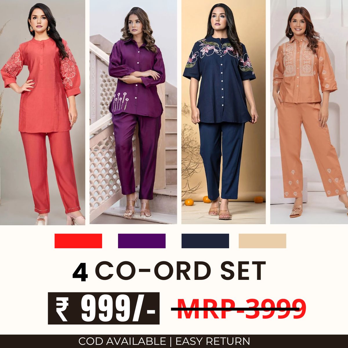 The 4 Co-ord Set Women Combo offers a versatile and stylish wardrobe upgrade for every occasion. This collection includes an elegant ethnic co-ord set, perfect for festive celebrations with its intricate prints and rich fabrics like silk or cotton in vibrant hues such as maroon or emerald green.