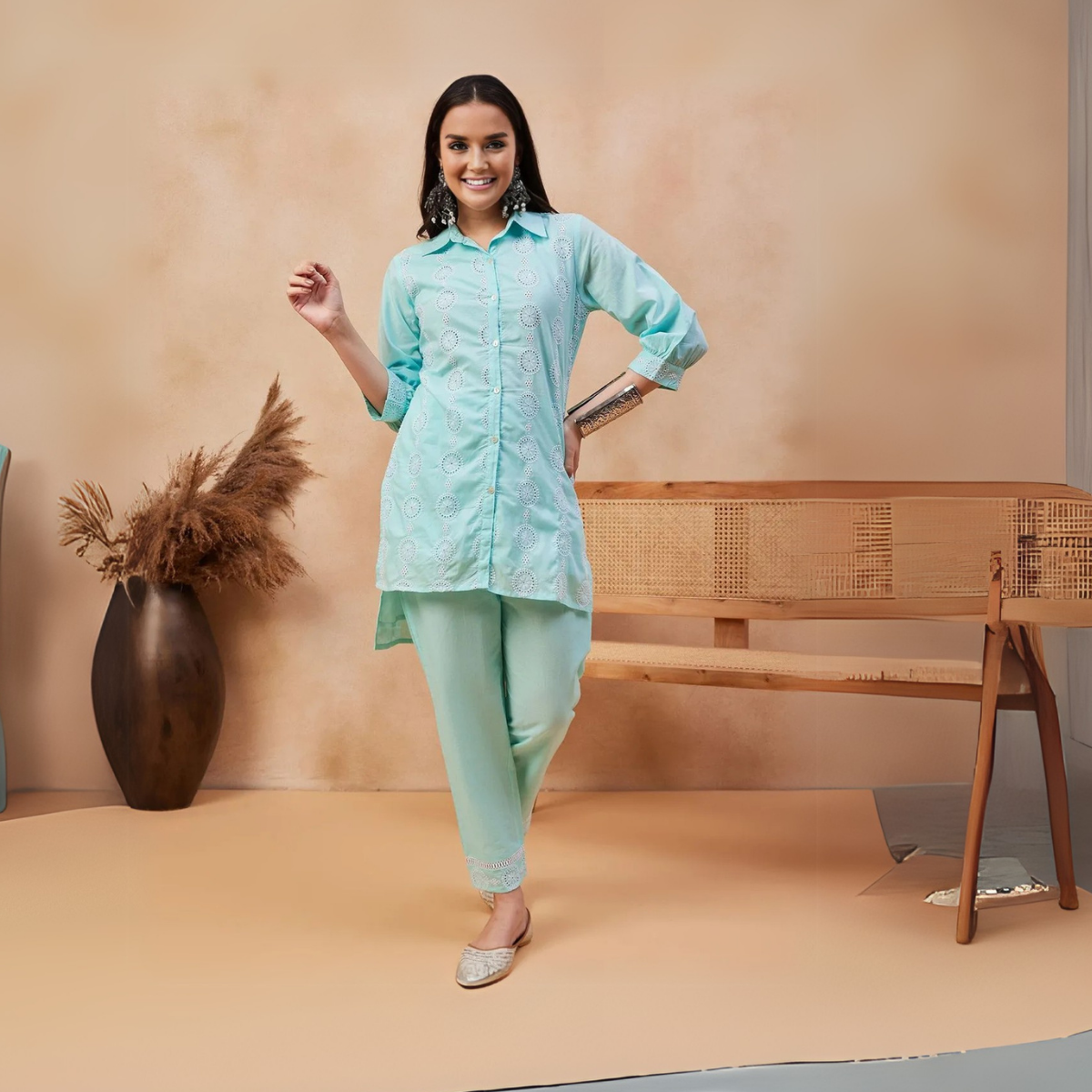 The casual cotton co-ord set is ideal for relaxed outings, featuring breathable fabrics and minimalist designs like stripes or solid colors, ensuring comfort and effortless style.
