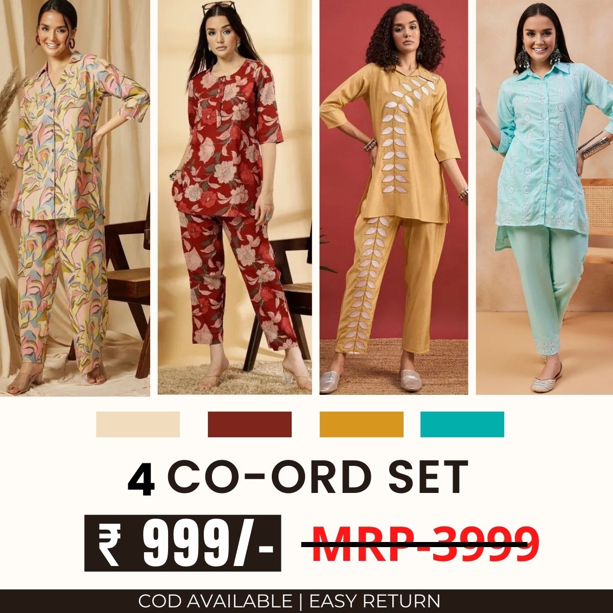 The 4 Co-ord Set Women Combo offers a versatile and stylish wardrobe upgrade for every occasion. This collection includes an elegant ethnic co-ord set, perfect for festive celebrations with its intricate prints and rich fabrics like silk or cotton in vibrant hues such as maroon or emerald green.